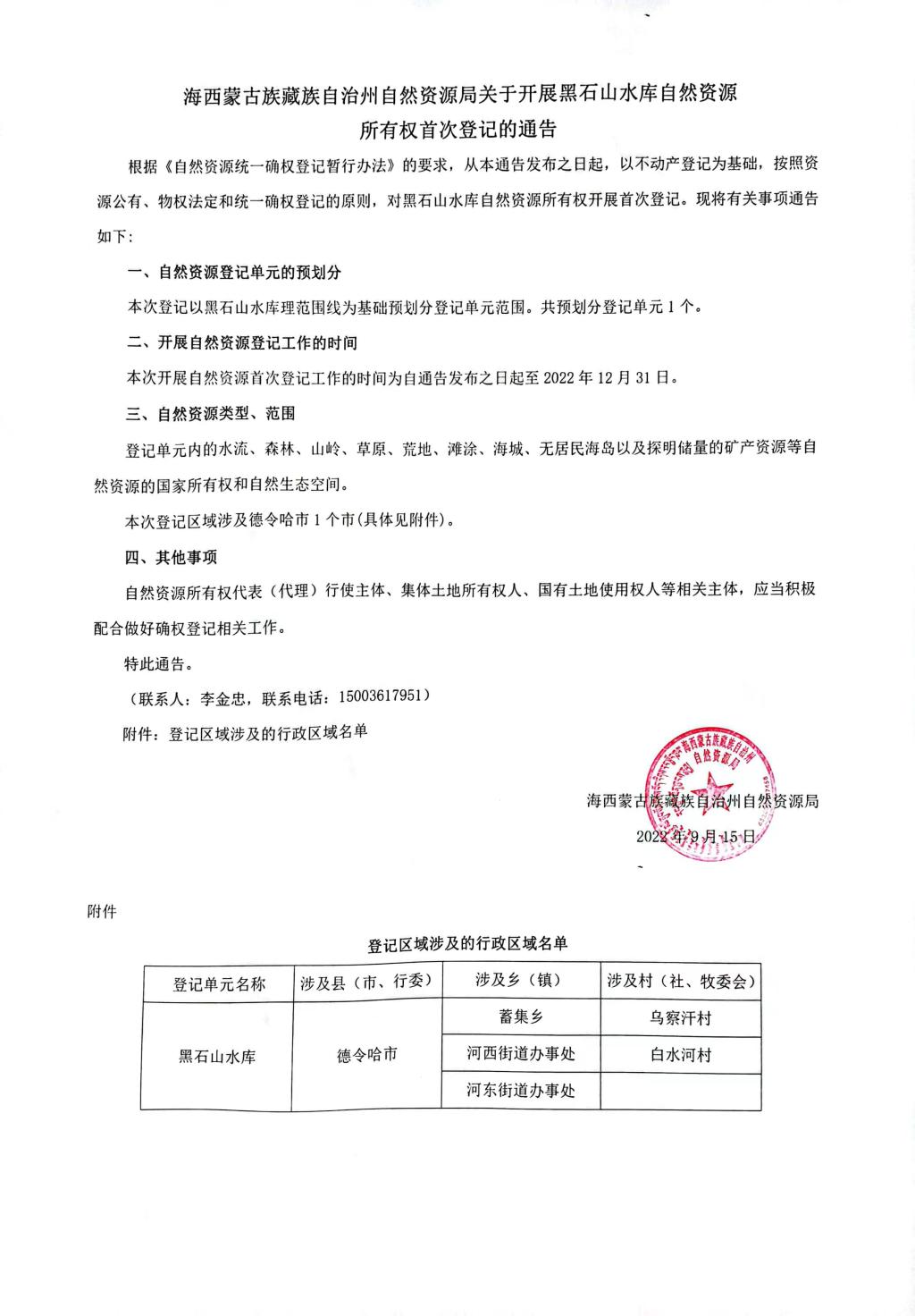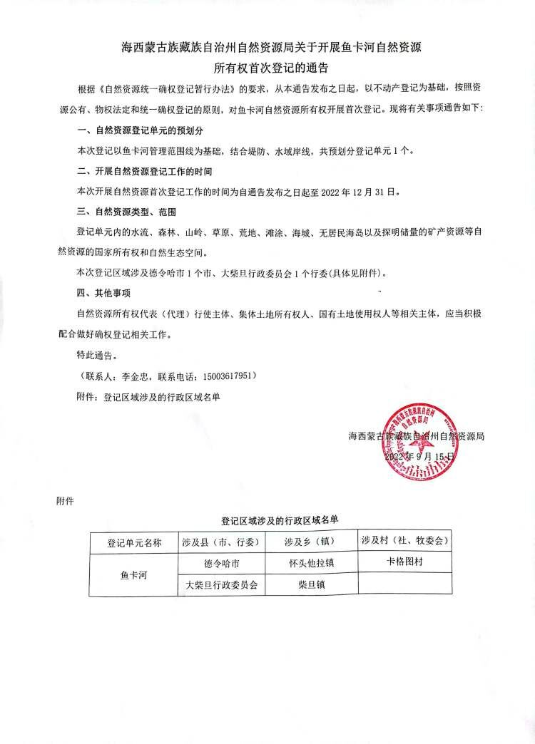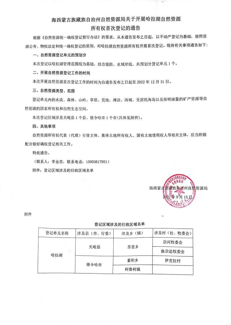 海西蒙古族藏族自治州自然资源局关于开展鱼卡河、黑石山水库、哈拉湖自然资源所有权首次登记的通告