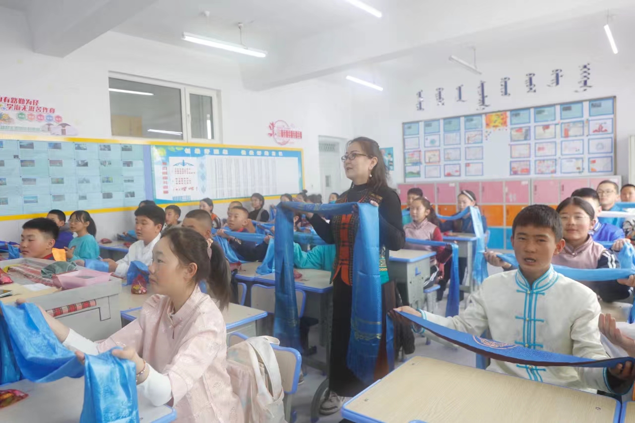 在民族学校小学部三年级二班,老师、家长和学生们正在举行具有民族特色的欢迎仪式,大家手捧哈达,互致新年问候,老师在给学生们逐个发放新课本,课堂顿时沸腾起来。在一年级开学第一课上,老师们围绕民族团结和国家安全两方面内容,通过PPT、视频、问答等形式,让学生们领略多彩民族文化和国家安全观念,学生们个个精神抖擞,听得十分认真。