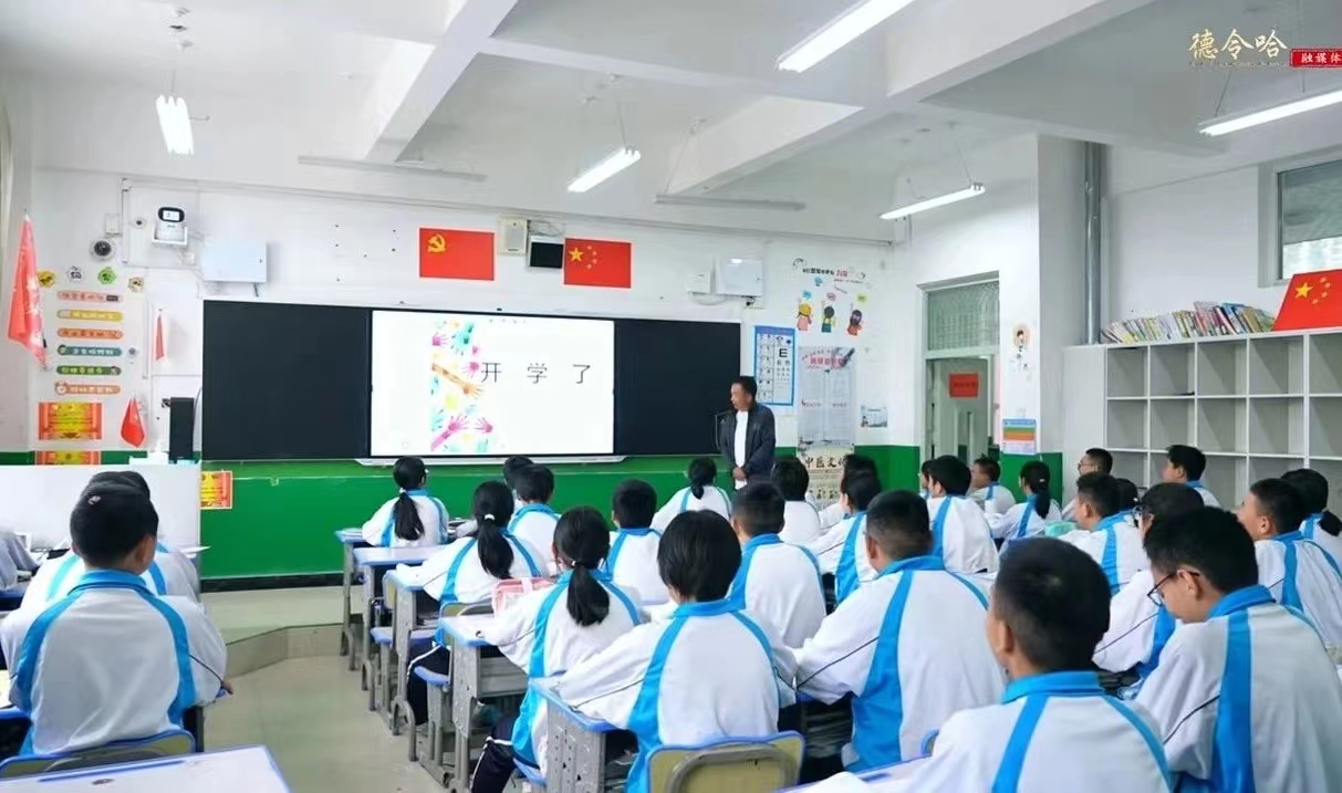 记者走进德令哈市一中,看到学生们已经有序地坐在教室进行“开学第一课”。在初三(4)班,一堂课由班干部向班级同学们讲述新学期“第一课”,并与大家开展积极讨论,交谈暑假的所见所闻和新学期的新愿望。