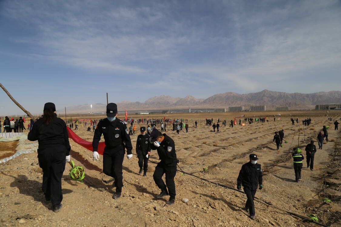 植树现场气氛热烈,干劲十足。大家两三人一组,运苗、挖坑、扶植树苗、挥锨铲土,培土踏实……动作娴熟,配合默契,栽下的一棵棵树苗,昂然挺立。经过大家的辛勤劳作,新栽树苗引风挺立,在明媚的春风中展现出勃勃生机,为德令哈的春天增添了一抹新绿。