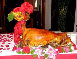 1、烤全羊:烤全羊是选择羯羊或两岁左右的肥羊为主要原料。羊宰杀后,去蹄及内脏,用精面粉、盐水、姜黄、胡椒粉和孜然等调成糊状,均匀地抹在羊的全身,然后用钉有铁钉的木棍,从头穿到尾,放在特制的炉灶上,并要不断地翻滚、抹料,约三小时左右即成。烤全羊外表金黄油亮,外部肉焦黄发脆,内部肉绵软鲜嫩,羊肉味清香扑鼻,颇为适口,别具一格。