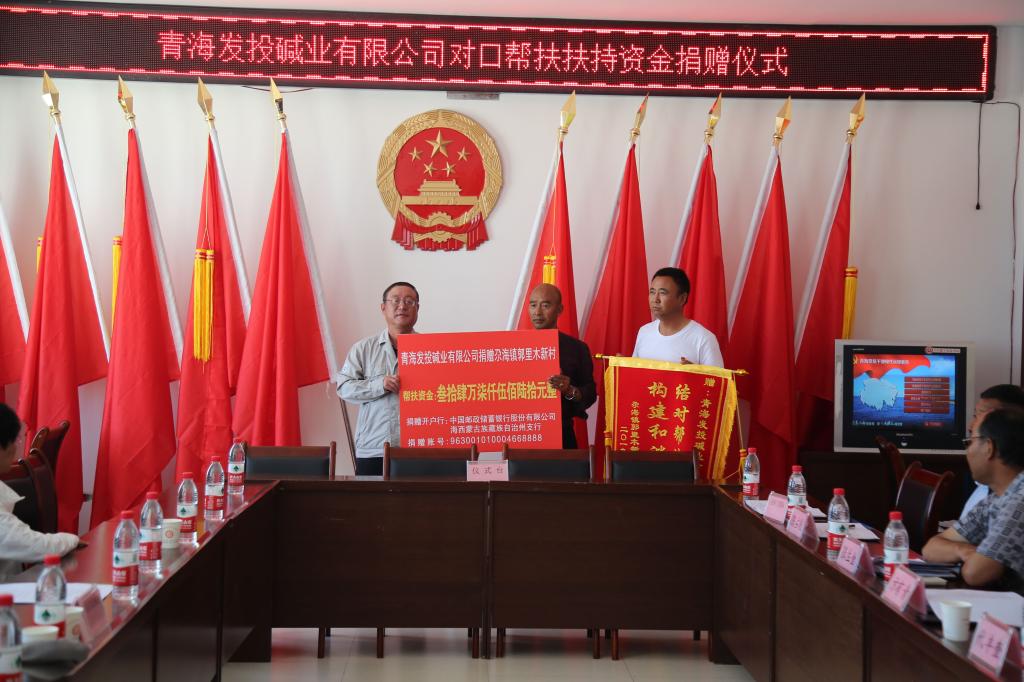 8月14日,青海发投碱业有限公司代表、郭里木新村三委班子成员共同举行扶贫资金捐赠仪式,为郭里木新村捐赠扶贫帮扶资金34万多元。