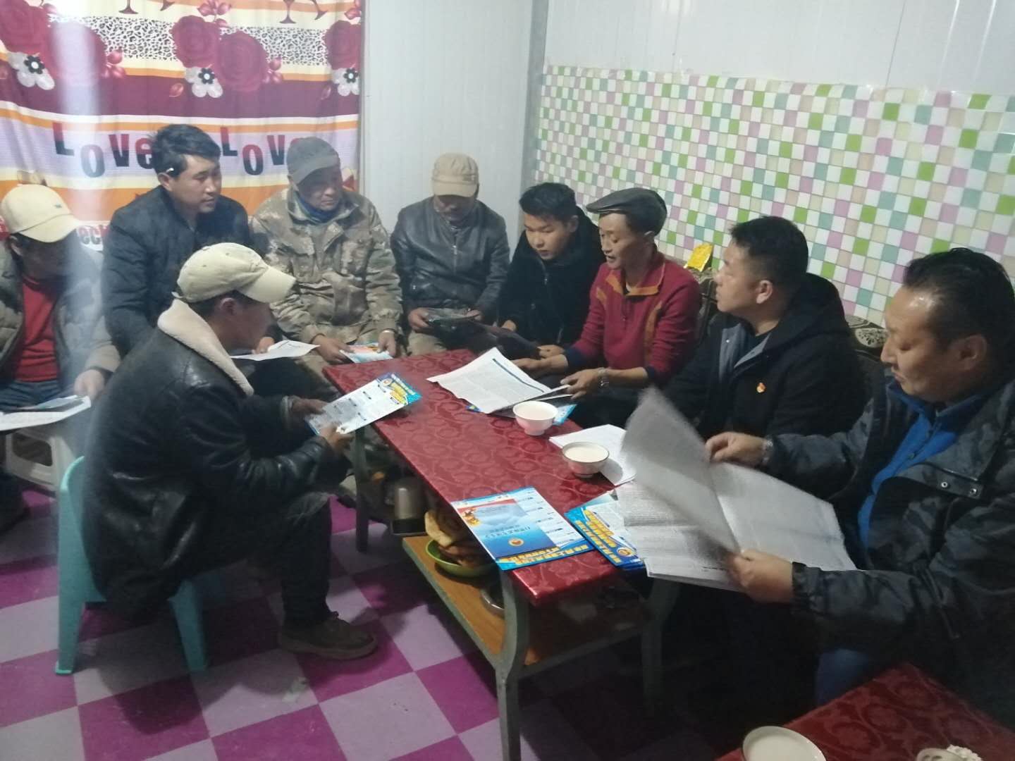 3月10日7时,德令哈市蓄集乡的办公楼里,人影在灯光的照射下叠加交错,几位乡镇干部在食堂吃过晚饭后聚集一起,商量着有关宣讲的事情。
