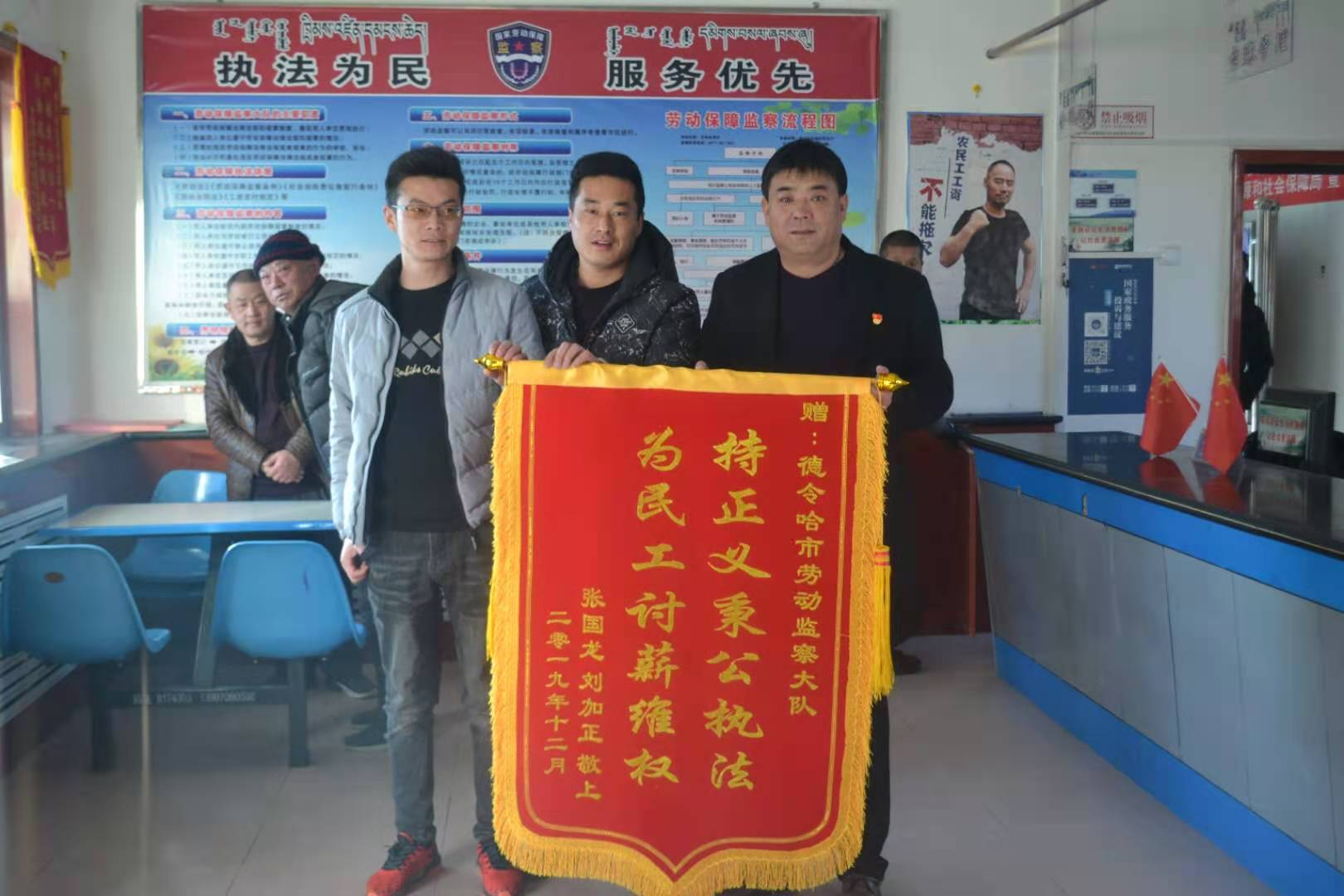 有这样一支队伍,每天穿梭在德令哈市的大街小巷,企业生产一线,以宣传劳动保障、法律法规为己任,以维护劳动者、用工单位合法权益为使命,严厉打击各类侵犯劳动者合法权益的行为,为农民工撑起一把“保护伞”,为德令哈市经济社会发展保驾护航。他们就是德令哈市劳动保障监察大队。