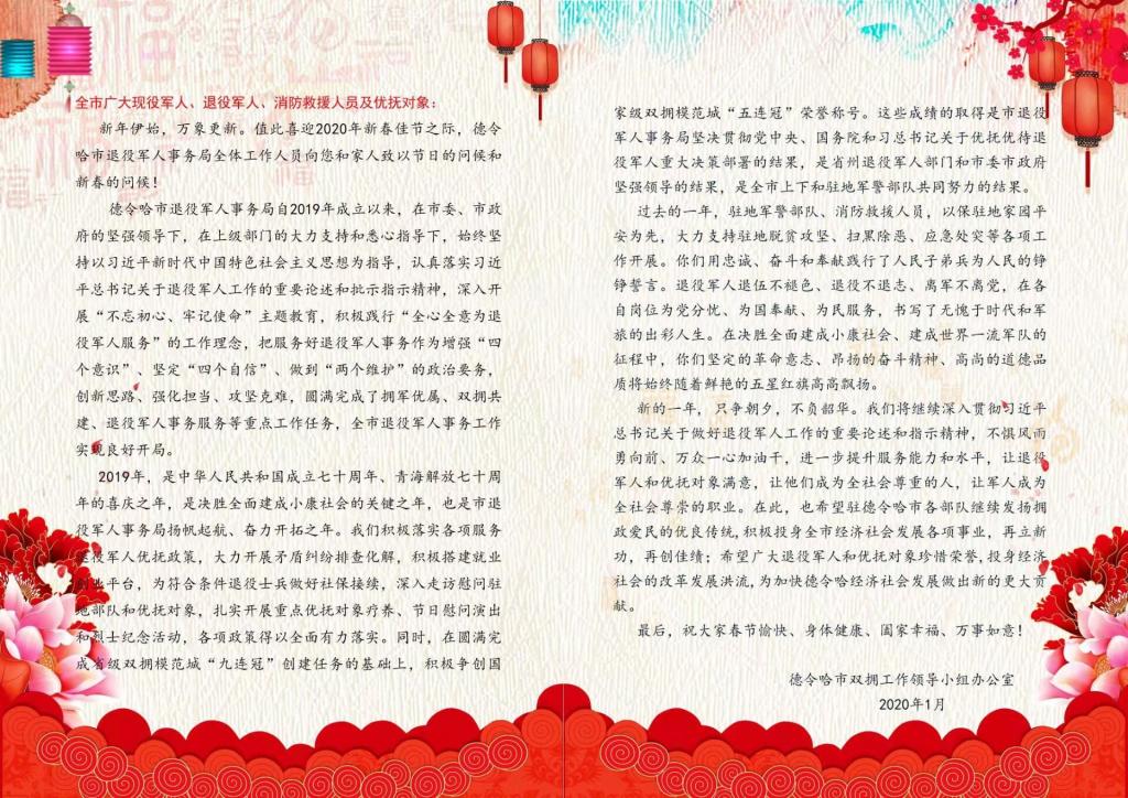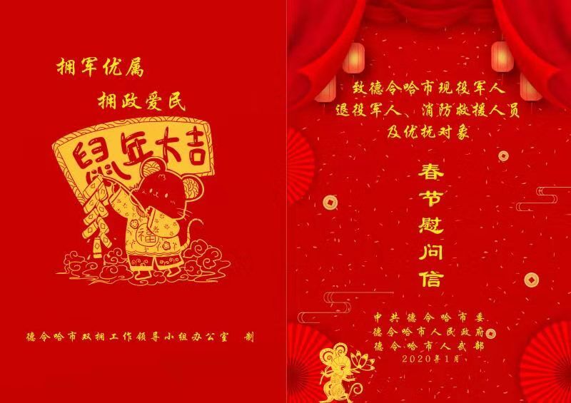 致德令哈市现役军人、退役军人、消防救援人员及优抚对象的慰问信 发布时间:2020年01月17日 16时40分来源:德令哈市退役军人事务局 上一条:缅怀革命先烈争做时代新人 下一条:走访慰问送真情 军地情深暖人心 【关闭】 0